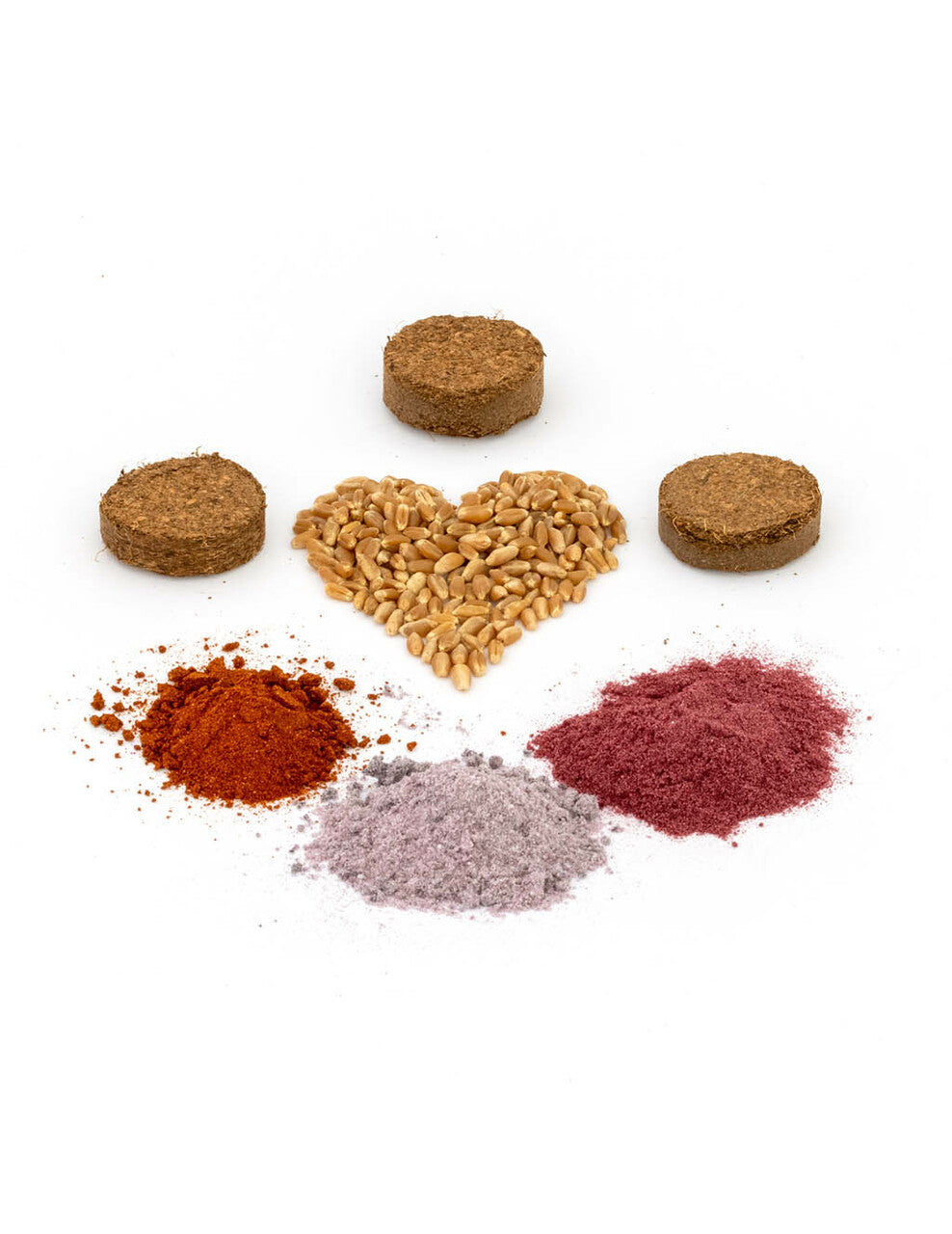 Kit includes: 3 powder-based coloring packets made with all natural and organic vegetable & plant extracts with dried vinegar; grass seed; 3 eco-coconut husk pucks (just add water to make soil).