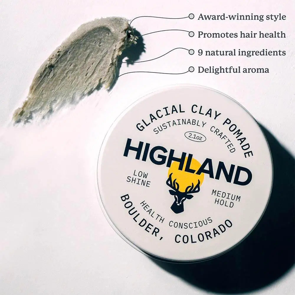 Our award-winning Glacial Clay Pomade delivers all-day, re-workable style without the bullsh*t. Medium hold, low-shine. Packed with powerful botanicals to boosts your hair & scalp health. Our 9, all-natural ingredient formula allows you to style with precision while nourishing + boosting the health of your hair and scalp with thoughtfully selected earth-based ingredients. Cruelty Free Sulfate Free Phthalate Free Paraben Free Gluten Free