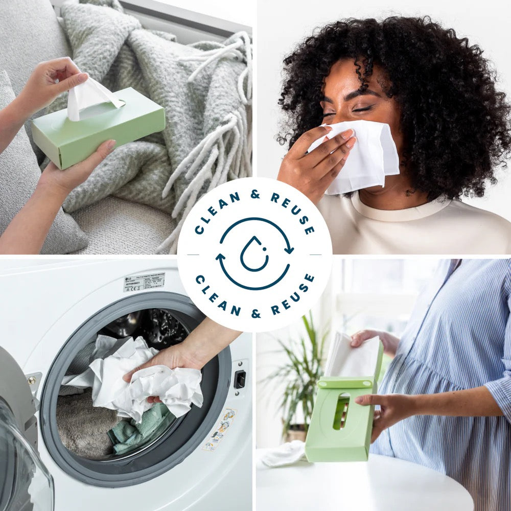 A colorful and convenient tissue box with 18 organic cotton tissues, eliminating the need for 18,000 single-use tissues!